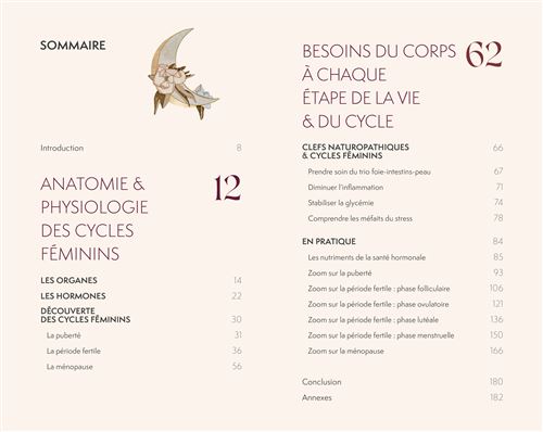 Ce livre met également l’accent sur l’importance du terrain, concept central en naturopathie : il s’agit de considérer l’état global du corps, ses éventuelles carences ou surcharges et sa vitalité à un moment donné. Comprendre son terrain permet d’agir de manière préventive ou corrective pour mieux vivre ses cycles, soulager les douleurs et prévenir les dérèglements hormonaux. Les règles douloureuses, l’aménorrhée, les hémorragies, les troubles de la fertilité ou encore les pathologies gynécologiques y trouvent des solutions naturelles et personnalisées.