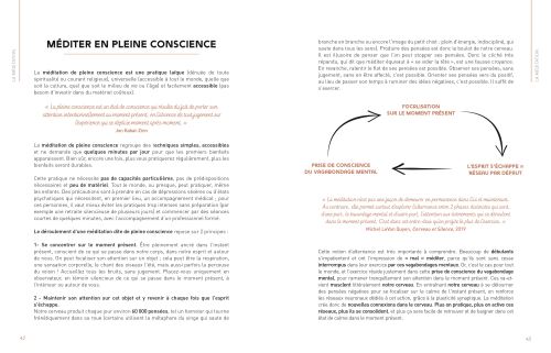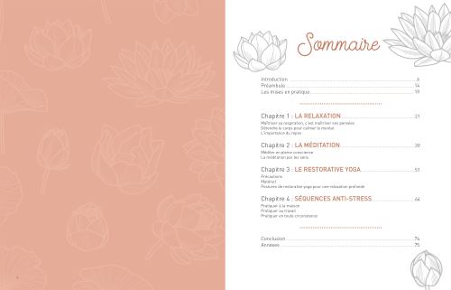 Chaque chapitre est conçu pour accompagner pas à pas, que l’on soit débutant ou déjà initié. On y découvre des techniques simples à mettre en place chez soi, au travail ou même dans les transports : respirations apaisantes, visualisations guidées, postures de yoga soutenues par des accessoires, mini-pauses méditatives… autant d’outils concrets pour ramener le calme dans le quotidien.