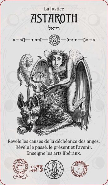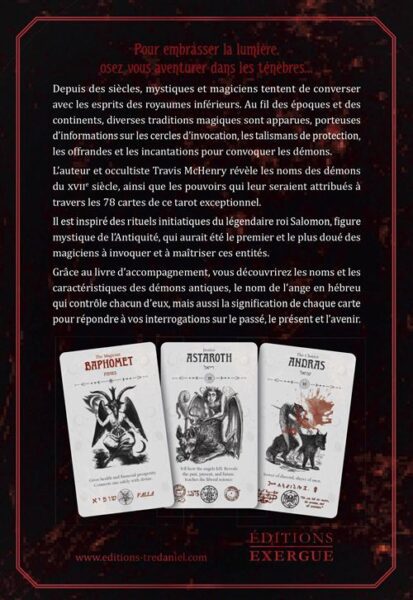 Le livre d’accompagnement permet de comprendre en profondeur la symbolique de chaque carte. On y découvre les noms et les caractéristiques des démons antiques, les anges hébreux censés les contrôler, ainsi que des indications précises pour interpréter chaque carte dans les consultations sur le passé, le présent et l’avenir. Cette approche unique allie tradition occulte et guidance spirituelle, permettant de naviguer entre lumière et obscurité en toute conscience.